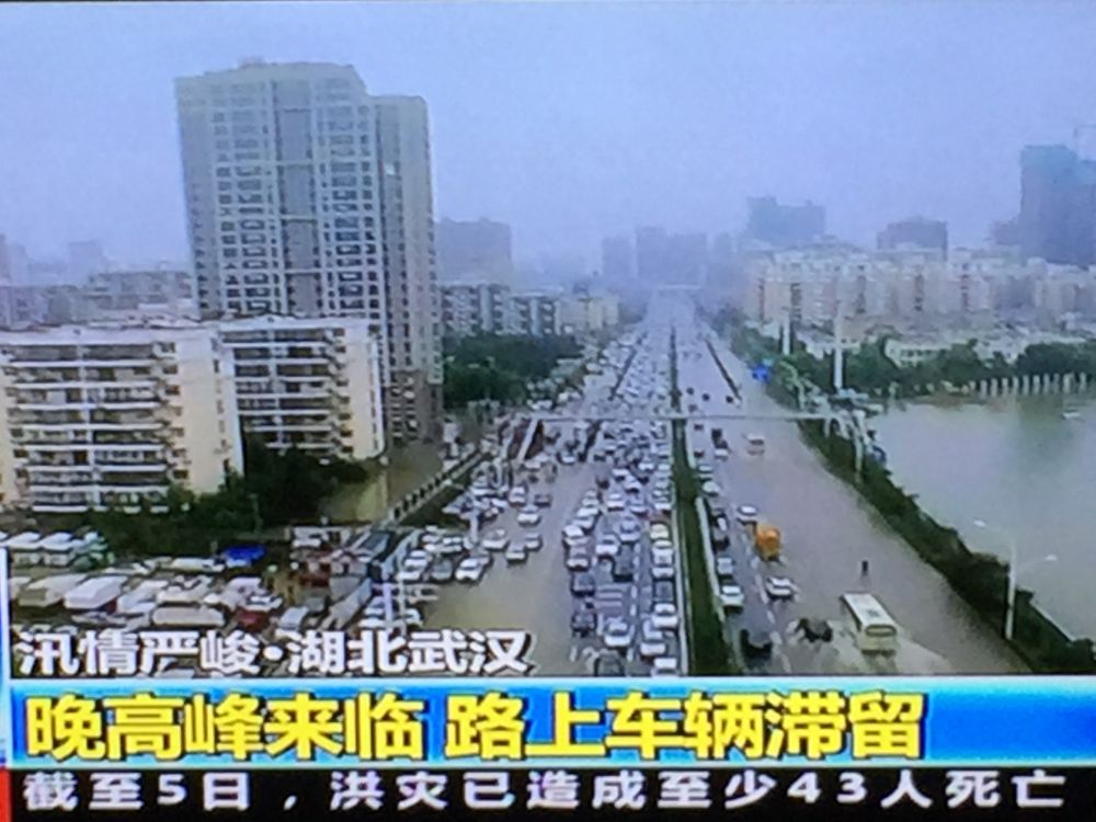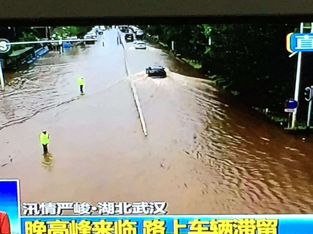 我们到达武汉那一天,已经连续下了四五天大到暴雨。当飞机飞近天河机场上空时,望下去那里真像是“从天而降的无边大河”,一片汪洋,漫无边际,很多道路被水淹没,只能通过路边的行道树猜测那是一条条路。值得庆幸的是,飞机差不多是在两场大雨之间间隔的时刻降落的,所以从机场到市区的途中,雨下得并不大。到了住处歇下来以后,雨便越下越大,稀里哗啦,没有停歇。第二天,又接着下了几乎一整天,按当地报纸的说法,武汉开启了“看海”模式。报纸还说,这么一个星期下下来,相当于把整个一座太湖的水“倒”到了武汉地区。