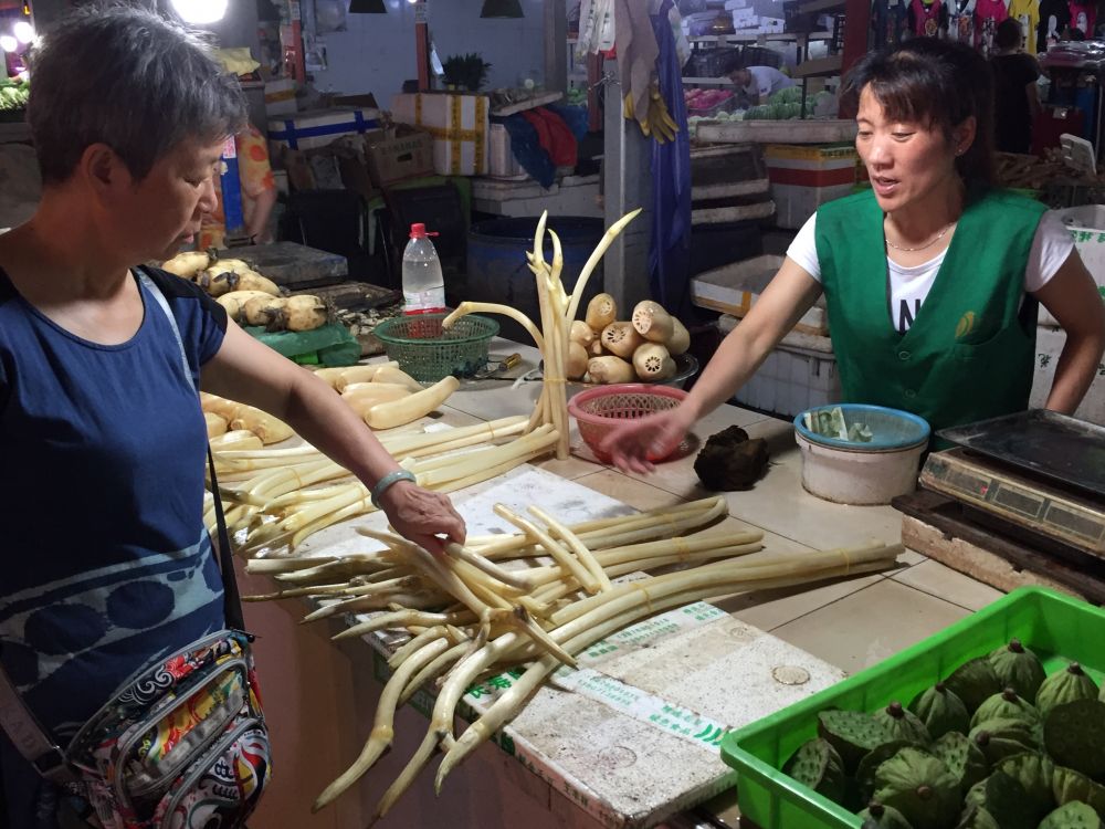 卖菜的摊位。这位商贩卖的是武汉地区特产藕带和莲子。