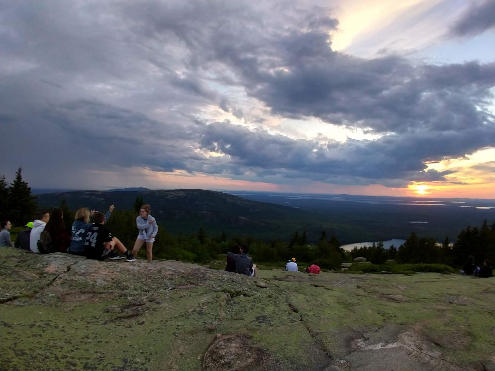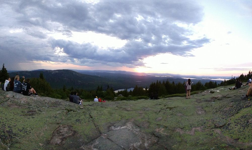 夕阳西下,结束一天行程之前,他们再次来到凯迪拉克山顶,在这里观赏灿烂无比的晚霞。像是无形中的约定,这里早已聚集了不少游人,大家静静地等待晚霞隐入夜幕,渐渐消逝的令人屏息的瞬间美景。