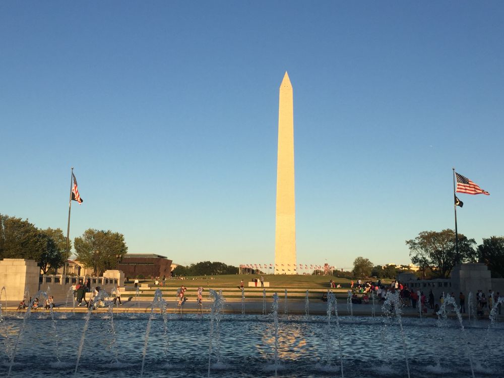 参观完非裔美国人历史和文化博物馆,我们迎着西下的夕阳来到国家广场西端的华盛顿纪念碑,以及位于华盛顿纪念碑和林肯纪念堂之间的国家二战纪念碑。