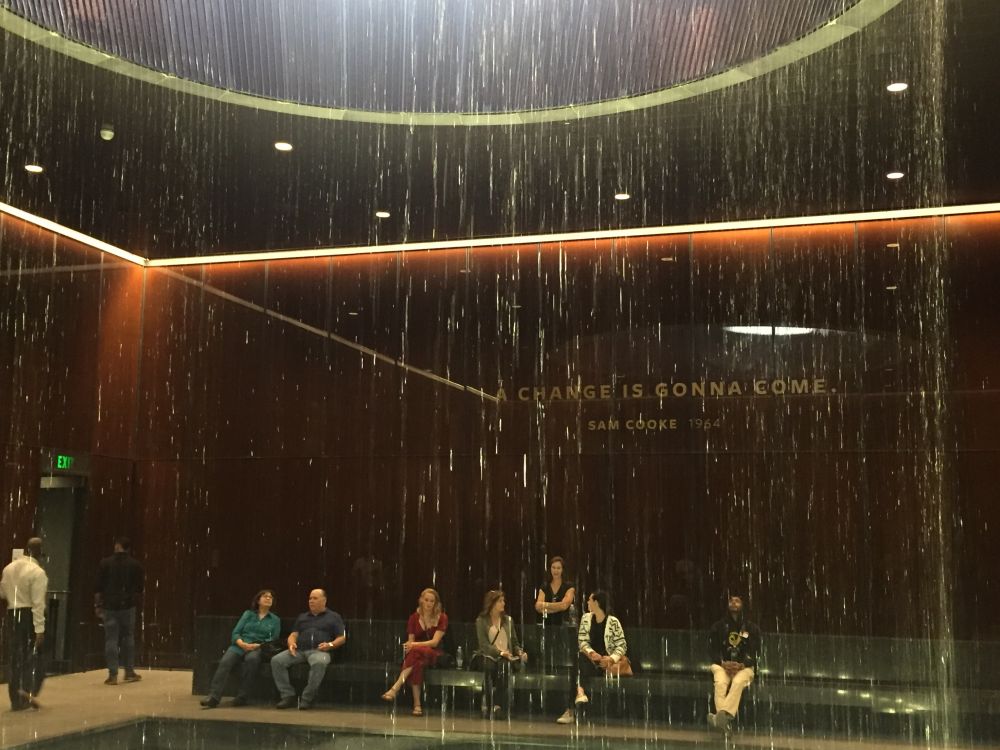 参观者通过参观非裔美国人满是血泪的悲惨历史,心中不免积蓄某种无法排解的压抑感,博物馆的设计者考虑的真周到,他们专门设计了一处“沉思庭院”(Contemplative Court):参观者在此留驻片刻,看着45英尺高的椭圆形天窗倾泻而下的圆柱形水柱,似一股清流流过人们的心田,排解着压抑的情绪,得到心灵的慰藉与平复,继续参观的行程。