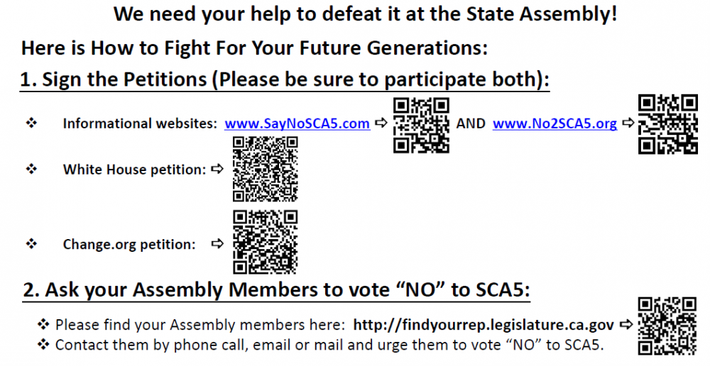 来自橙县的Flora问到,当前我们应采取什么样的战略来打败SCA5?Bob Huff参议员说,当前最实际的做法,是大家发动起来,直接联系自己选区的众议员,告诉他们你的诉求,要求他们明确表示不支持任何形式的SCA5,即“against the bill in any way, shape or form”。同时,在那些摇摆区,支持共和党的竞选人(如65区的Young Kim挑战现任的Sharon Quirk-Silva,48区的Joe Gardner,57区的Rita Topalian等)在此次中期选举中挑战并战胜现任民主党议员,以此来向加州的民主党领袖施压。Connerly建议说,你们应重点向那些亚裔议员施压,要他们声明反对任何以种族作为大学入学标准的提案形式(作者注:49区Monterey Park的Ed Chau,19区San Francisco的Phil Tang,28区Campbell的Paul Fong, 66区 Torrance的Al Muratsuchi,9区Sacramento的Richard Pan等)。
