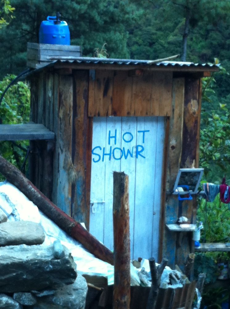有了上一站洗澡的爽快,这一晚照例还要洗澡,这次就比较特别了。洗澡房是山坡上孤零零的一木屋,店家把热水壶拎到小木屋的顶上,把热水先灌到顶上的一个塑料桶,然后请我入内洗澡,美日:淋浴。我问道:“如水用完了咋办?”店主读高中的儿子说:“你可以叫我,我再来加水。”我来回目测了几次,从这孤零零的木屋与那厨房之间的距离,大概有10多20米左右。然后想像着,全身肥皂泡还没洗尽,水却没了;于是全身赤裸,湿淋淋地探出头来,扯着嗓子喊:“I need hot water!”,然后再缩回小木屋里,赤身地,无所事事地等着热水的情形。最后决定,把大盆放满热水洗了就好,我盆浴了。我连冷水擦身都干的人,这已经够好了。但木屋的四个壁面直通通的,没有挂勾,没有坐椅,换洗的衣服只能放在外面山石上。山里不会有人,开着门脱穿上衣没什么,至于脱穿裤子就要用到金鸡独立,又蹦又跳的了。