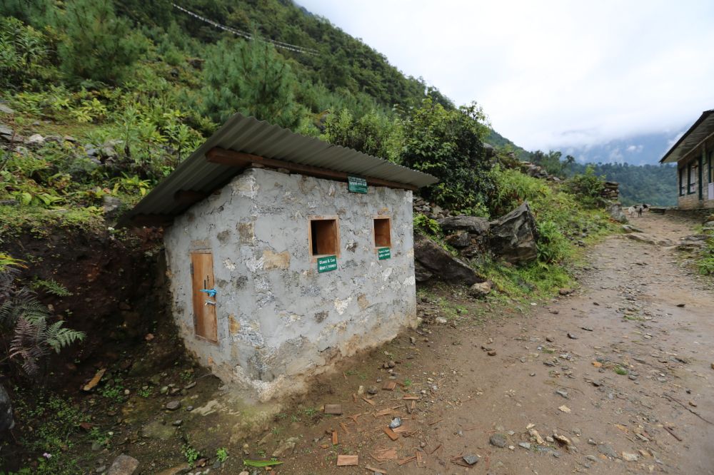 饭后我要上厕所,主人很客气地指示说:在屋后的山坡上有厕所。爬了两层坡上去,登高可望远,气喘已嘘嘘。最后在一个小屋前徘徊数次才确定它就是厕所,因为它一没有味,二不见那物的痕迹。我一生阅茅坑无数,这是最新奇的一座。坡边一小木屋,地板是高高的,悬空着的,板上挖了两个不同形状的洞,两洞的距离很近,方向是垂直相交的,请君将物入此洞之意明确,但为什么要那么近的挖两个方向相垂直的洞呢?那么近的距离,两人是不可能同时蹲得下的。男女要分洞使用吗?也可能是有宗教意思的。洞的下面是一个大斜山坡。山坡堆满着细小的碎木屑,碎树叶,“人体出来的物”一钻过洞,就深深地陷进柔软的碎木屑或细树叶堆里,并被包围覆盖而不见痕迹。在那里别说是看到,连气味都没有,你只有用想像力,才能想到那碎树叶底下掺和着什么东西。另外也没有手纸的痕迹,说明这些树叶有部分擦屁股功能。无任何异味,无任何人类“方便之物”,无任何厕所的痕迹。如厕时可以大口呼吸极清新的空气,这种“高端,大气,上档次”的如厕,只在喜马拉雅才有。照片中,2个阶梯之上的山岙中就是那“高大上”。