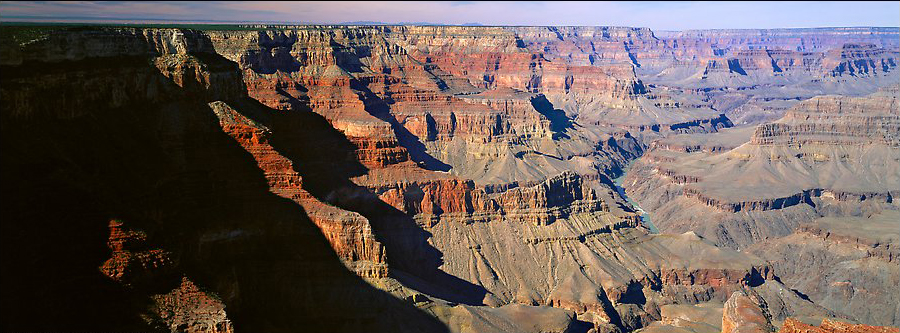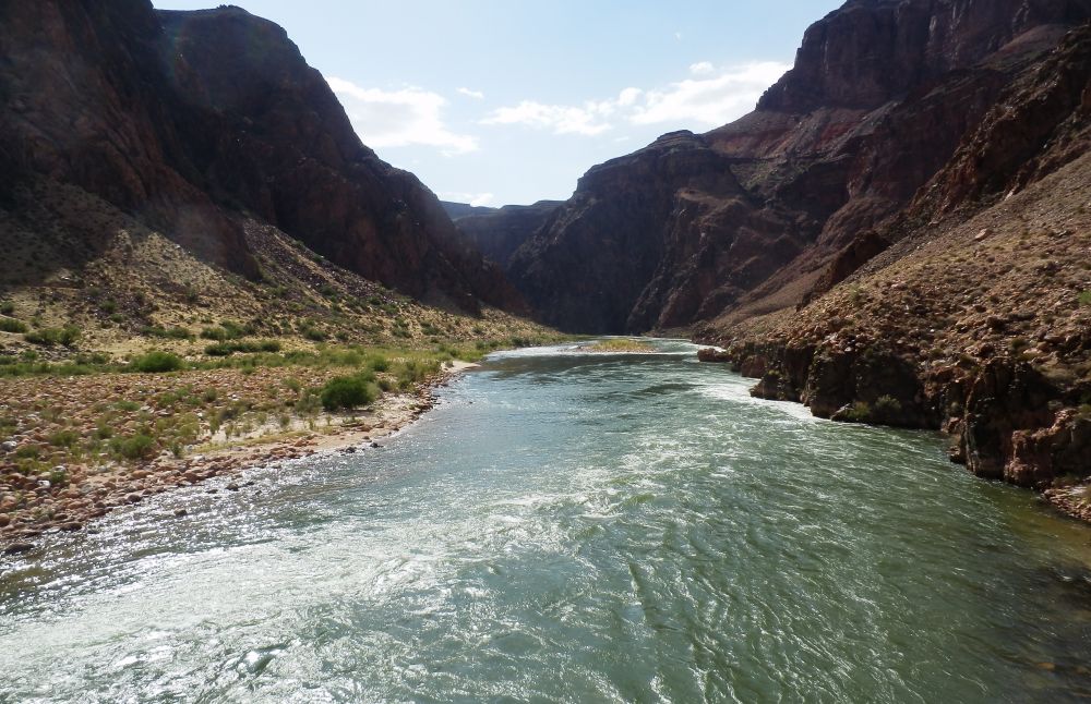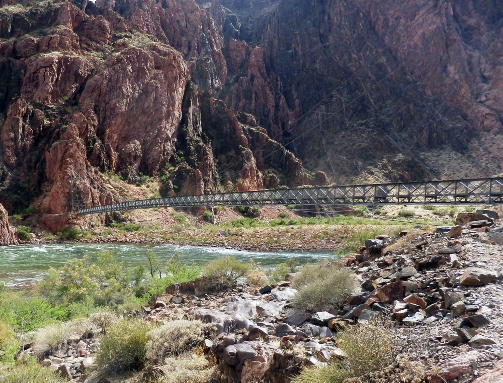 远远地看到了一个大钢缆吊桥,翻上土坡后,只见一条宽阔的大河,坦坦荡荡,从高山之间直流而来。在浅滩处,翻起几个浪花,发出大大的声响,然后又旁若无人地沿着山脚直流远去,在荒凉褐色的群山之间留下一条平平阔阔的深绿色。不用问,这就是赫赫有名的科罗拉多河了,我们已身处大峡谷的最低处了。