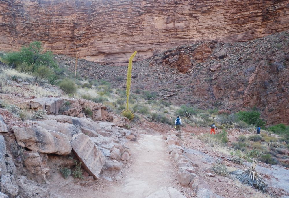 会长走几步就要停下来,让心跳跟呼吸平衡一下,走得很辛苦。他在黑龙江插过队,北大毕业,当年可是市里的大学生游泳冠军。开始爬山才两周,就来挑战R2R,其精神不老,其耐力坚轫。而美女的叫苦声是连天的,她不断地提着假设,如有人愿把她抬上去,她愿出1000美元,其诚意昭然。抬,要两个人,一人才分到$500;一个人全包就好。“抱美女上山,乃快事一桩也;举头看高山,叹身体不好也(玩笑)”。后来才知,大峡谷确有这项服务,用直升机吊上去的起价是1500美元/人。最后是周科学家动了侧隐之心,一拐一拐地背起了她的背包,当然包里的水须放空。大峡谷跟其它爬山不同:其它的爬山,如途中想退回,那就是往下走;而走大峡谷,如途中想退回,就得向上走。本来是累的不行了才想回去,现在再难上加难,拖死你,磨死你。人生的路也是那样。