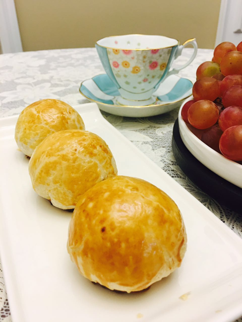 这是第二次的作品,第一次的成品是严格按照网上的做法,在刷好蛋黄液后划三刀,以防止冬蓉馅膨胀爆裂,网上看到的成品都是椭圆形的,所以我的第一次作品也是如此,明明自己包的很圆,出来时全是椭圆的。琢磨之后明白何故,第二次再做时看见刷完蛋黄液的圆圆小饼,好像HAPPY FACE,所以我尝试看看,未烤之前的感觉还不错,出炉后才知道手上功夫不到家,落刀的力度严重影响了成品效果,儿子摇头说:咦,恐怖!