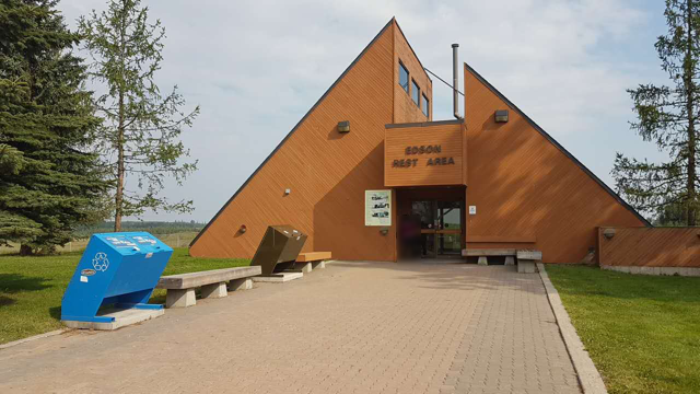 早餐后我们离开Hinton小镇,沿着十六号公路东行,大约50分钟左右我看见Edson休息区的提示牌,当我们驶入休息区,入眼的便是这座造型独特的建筑物。