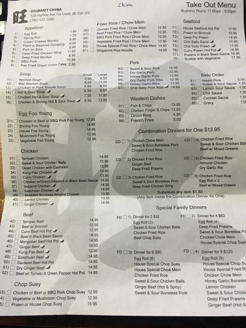 中午时分我们行驶至Fox Creek,先生准备去加油,我正好需要上洗手间,进油站前先生说:旁边有间中餐馆哦,可以满足你的中国胃。我带着女儿下车,心里满是问号,不知这么偏远的地方中餐水准如何?