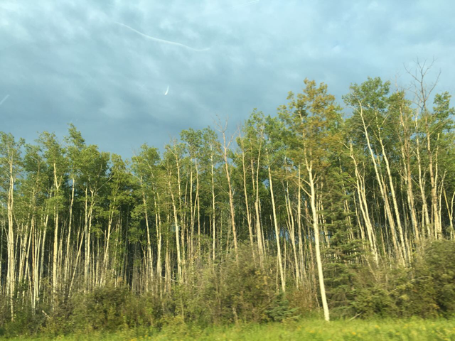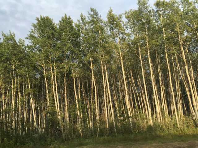 道路两旁的树木变成白桦树了