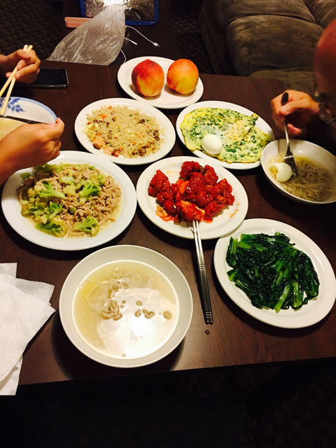 知道晚上预定的套房有厨房,中午未吃完的炒饭、咕噜肉打包了,我简单炒了个三个菜:台湾椰菜花炒肉丝、韭菜鸡蛋、炒香麦菜,煮了三碗清汤肉丝面