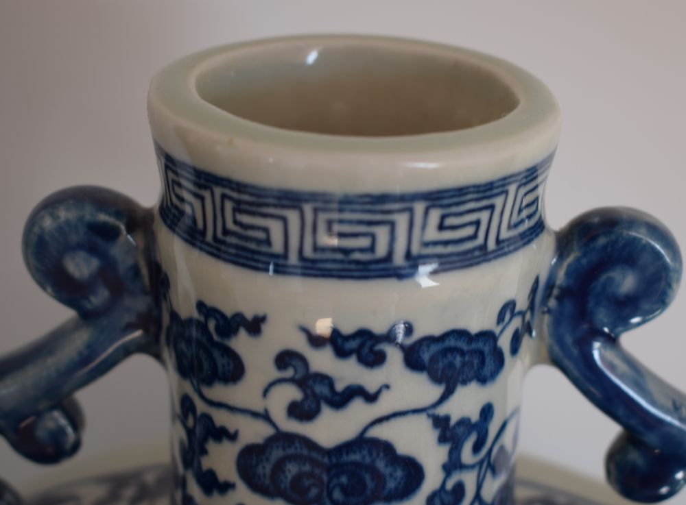 此青花八吉祥抱月瓶恢宏雄伟,古雅端庄,为雍正时期寥寥可数的最大器型之一。唇口直颈,颈饰变形双螭耳,极 具 鲜 明的时代特征,为雍正至乾隆早期瓶类典雅的耳式之一,圆硕而扁平的瓶体与灵空优美的双耳搭配,在整体视觉效果上达到均衡虚实之感,使得器形稳重而不失秀 美。通体以青花装饰,瓶腹两面绘主题纹饰莲托八吉祥,腹部中央圆形凸面则饰以放射式图案花,其它部位均绘以缠枝灵芝纹。其青花苍雅亮丽,翠妍欲滴,釉质清 莹厚润,点涂一法竭力展现接近永宣青花凝重的水墨效果。尤其八吉祥纹饰,纷繁复杂,绘画却细致入微,颇见功力,两侧飘带折叠多变,轻盈如真,动感强烈,为 雍正青花御瓷少有之隽品。