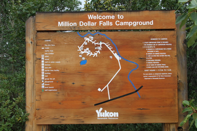 下午2点多到了Million Dollar Falls Campground. 这是我们一路上的第一个真的camground, 是Yukon政府管理的,一共有34个campsites, 每个12加元(包括生火的木头),营地之间都有很多树隔着。Campground有food storage, 有厕所,但没有洗澡的。