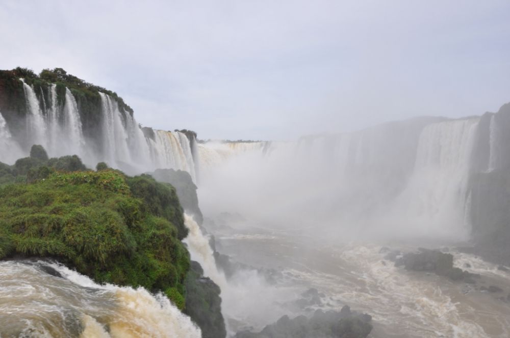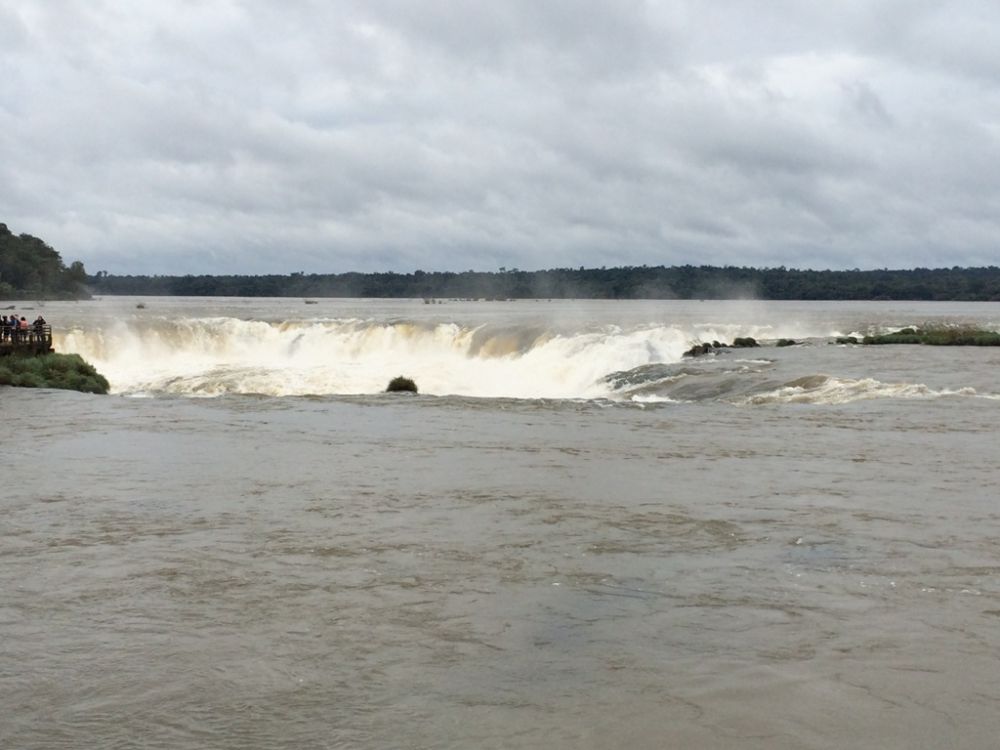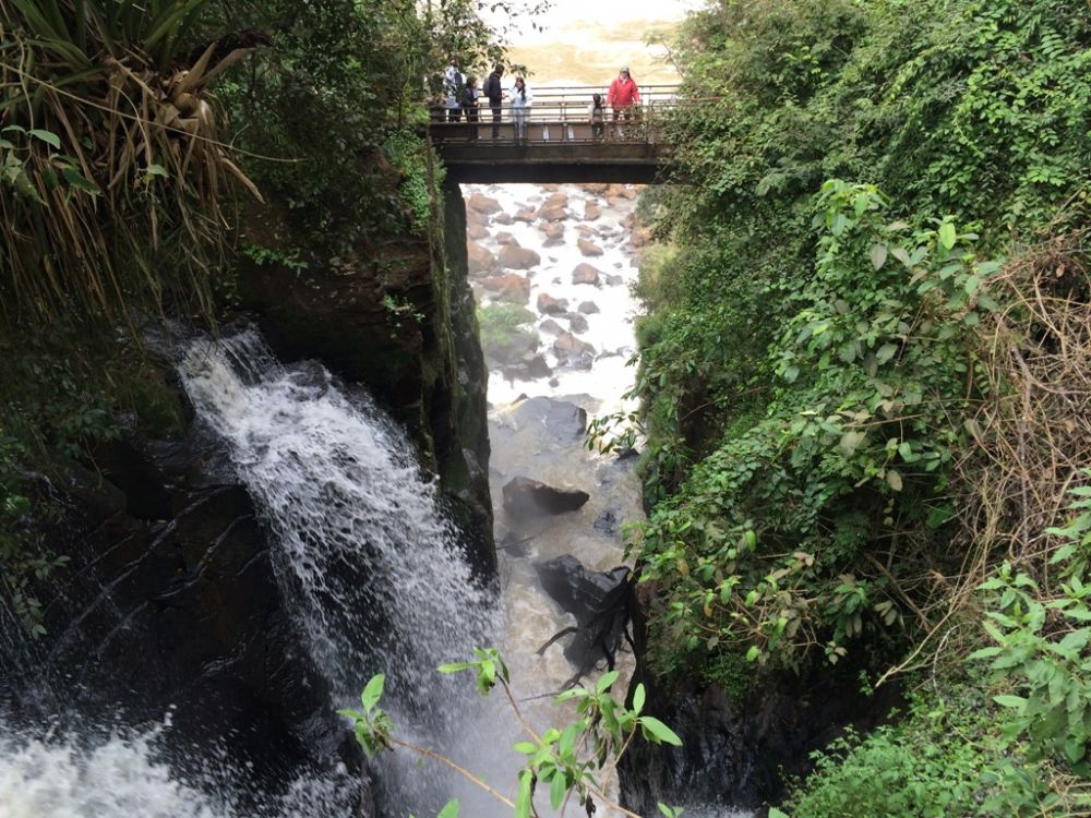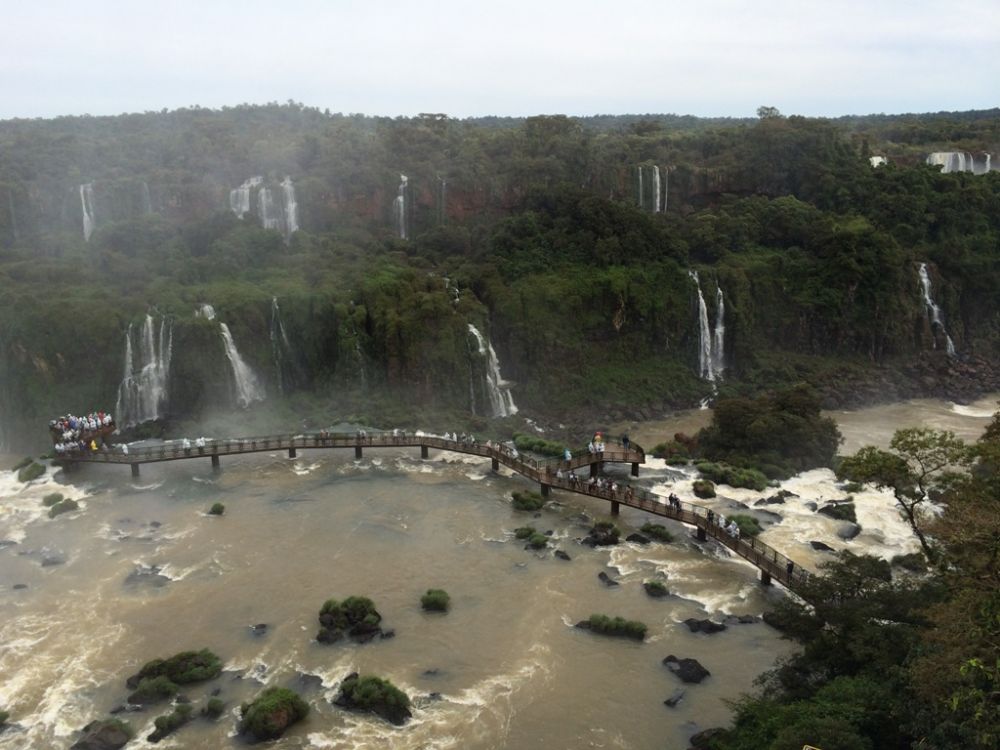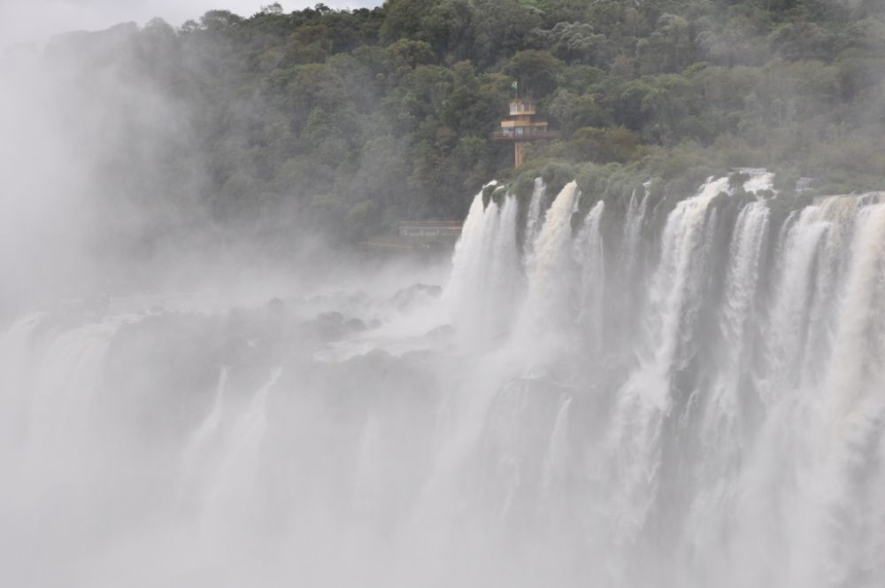 早晨吃过早餐散步到小城南部货币兑换处,换得少许巴西雷纳尔。我们打算乘Bus过境到巴西一侧的伊瓜苏瀑布,然后乘下午3:35的航班从巴西一侧的Foz do iguacu机场飞往里约热内卢。 Puerto Iguazu 小城很小,10分钟步行到汽车总站,到7号站台看到写有Foz do iguacu 的Bus停在站台里,上车买票,15 peso。车行10分钟,到达阿根廷边检,全体下车盖章出境后上车。我们告知司机需要到巴西边检办理入境手续,车行过桥, 桥下河水是流向伊瓜苏瀑布的,转眼到达巴西边检,我们下车,其他几个乘客也要跟着下,司机示意让他们坐下,本地乘客不必边检。司机告诉我们可以凭车票乘下一趟Bus。顺利办完入境表格,盖章,看到此处只有边检,没有货币兑换处,商店等设施。我们决定不等下一趟Bus,走路600米到前往巴西伊瓜苏瀑布汽车站。这里是Foz do iguacu城的郊外,在汽车站等了3分钟,过去几两去其它方向的Bus, 2路Bus终于出现了,上车买票,3个雷纳尔,也可以用peso, 推过旋转闸门来到Bus后部。Bus行驶20多分钟,中途经过Foz do iguacu机场,再行驶10分钟来到巴西伊瓜苏瀑布公园正门。排队用信用卡买票进门,乘双层Bus到达瀑布区。瀑布区为一条步道,从右到左眺望阿根廷一侧的瀑布全景。在步道尽头分成两路,一路步道远远深入水上直到魔鬼咽喉对面200,300百米处,一路乘电梯上到瞭望塔,眺望瀑布全景。