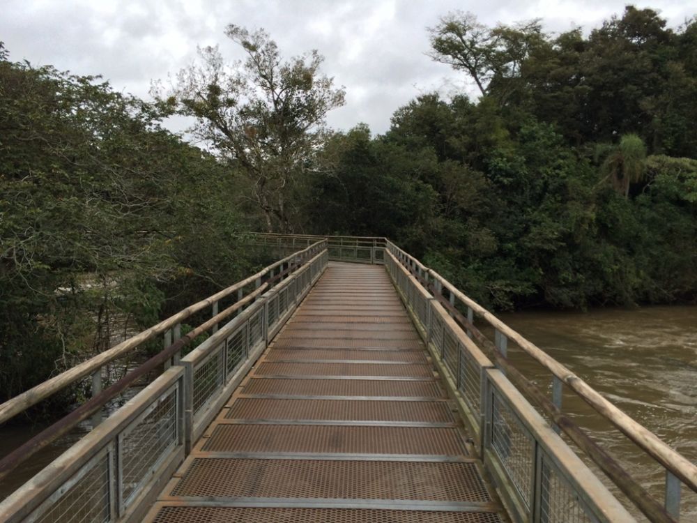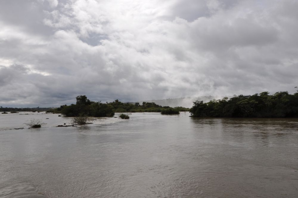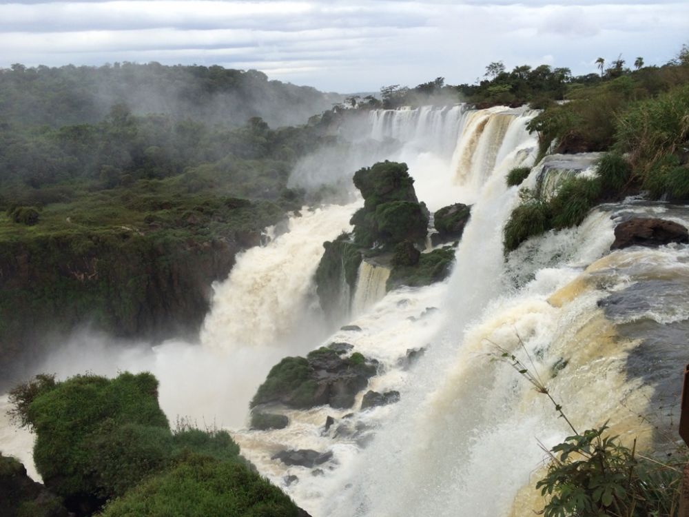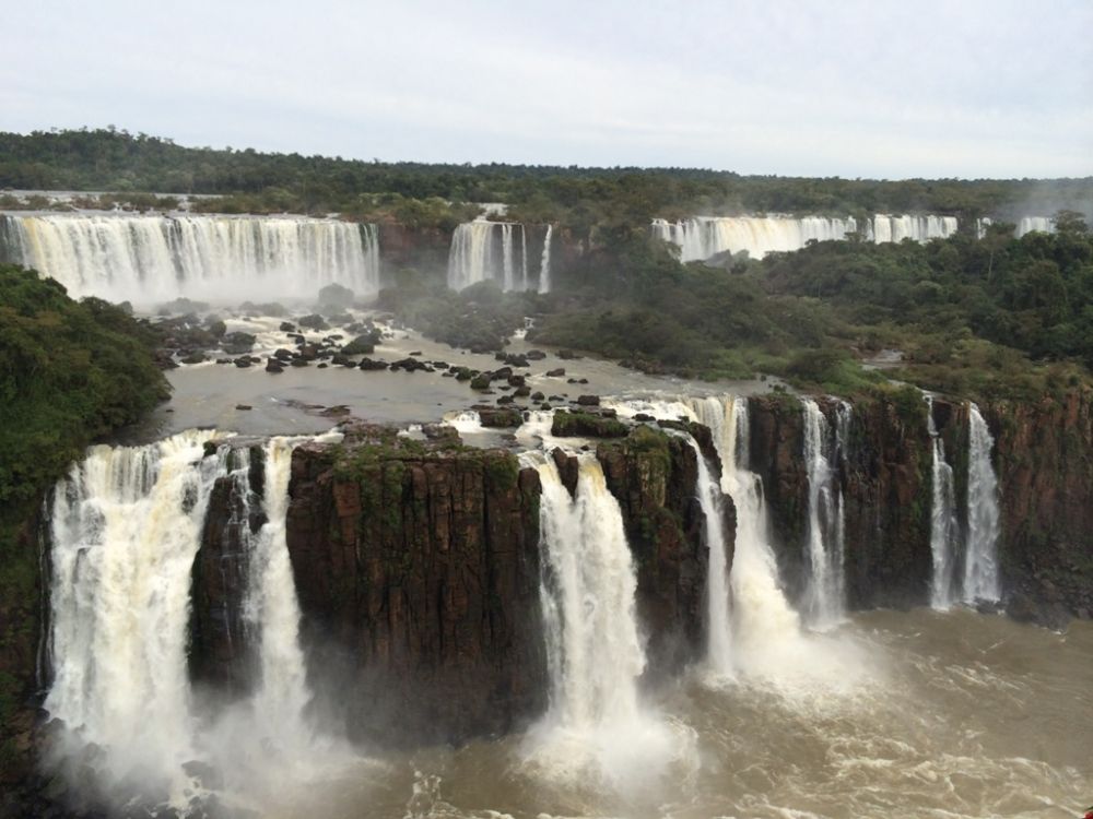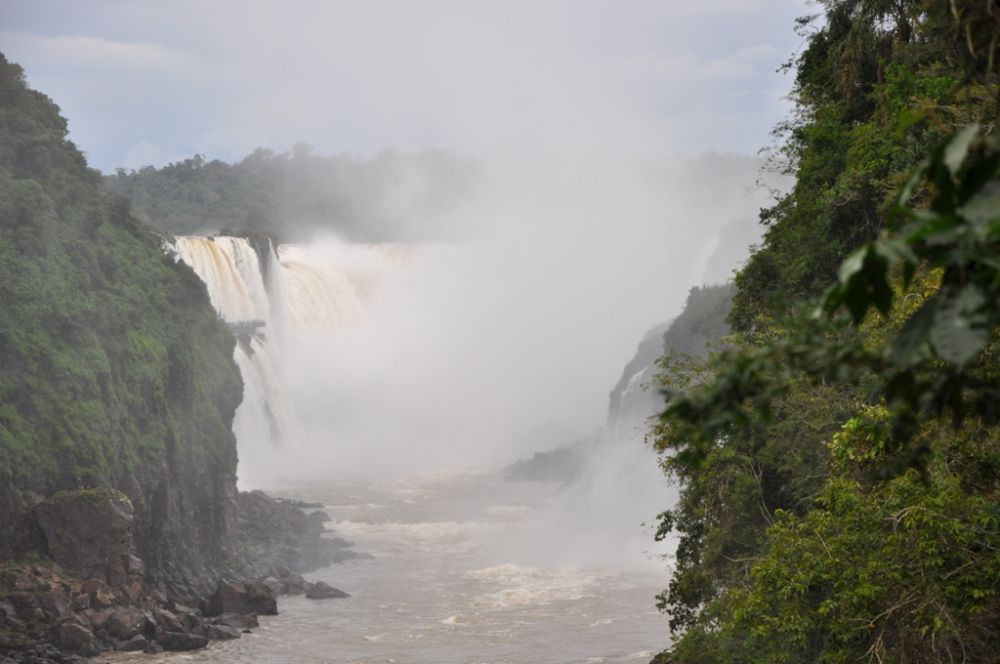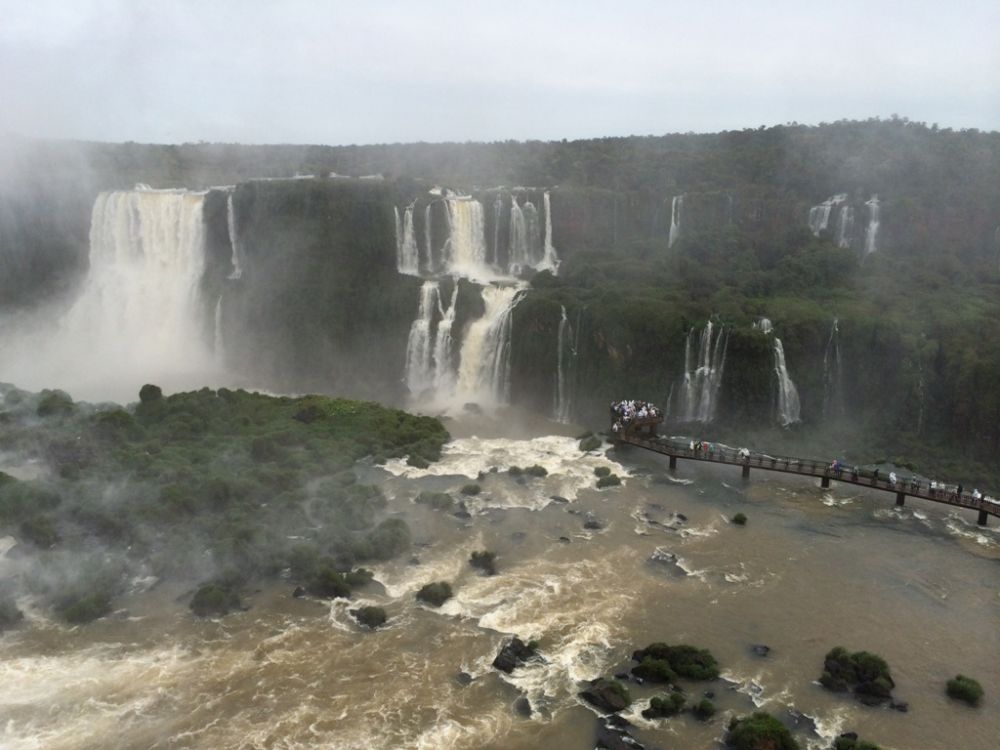 早晨吃过早餐散步到小城南部货币兑换处,换得少许巴西雷纳尔。我们打算乘Bus过境到巴西一侧的伊瓜苏瀑布,然后乘下午3:35的航班从巴西一侧的Foz do iguacu机场飞往里约热内卢。 Puerto Iguazu 小城很小,10分钟步行到汽车总站,到7号站台看到写有Foz do iguacu 的Bus停在站台里,上车买票,15 peso。车行10分钟,到达阿根廷边检,全体下车盖章出境后上车。我们告知司机需要到巴西边检办理入境手续,车行过桥, 桥下河水是流向伊瓜苏瀑布的,转眼到达巴西边检,我们下车,其他几个乘客也要跟着下,司机示意让他们坐下,本地乘客不必边检。司机告诉我们可以凭车票乘下一趟Bus。顺利办完入境表格,盖章,看到此处只有边检,没有货币兑换处,商店等设施。我们决定不等下一趟Bus,走路600米到前往巴西伊瓜苏瀑布汽车站。这里是Foz do iguacu城的郊外,在汽车站等了3分钟,过去几两去其它方向的Bus, 2路Bus终于出现了,上车买票,3个雷纳尔,也可以用peso, 推过旋转闸门来到Bus后部。Bus行驶20多分钟,中途经过Foz do iguacu机场,再行驶10分钟来到巴西伊瓜苏瀑布公园正门。排队用信用卡买票进门,乘双层Bus到达瀑布区。瀑布区为一条步道,从右到左眺望阿根廷一侧的瀑布全景。在步道尽头分成两路,一路步道远远深入水上直到魔鬼咽喉对面200,300百米处,一路乘电梯上到瞭望塔,眺望瀑布全景。