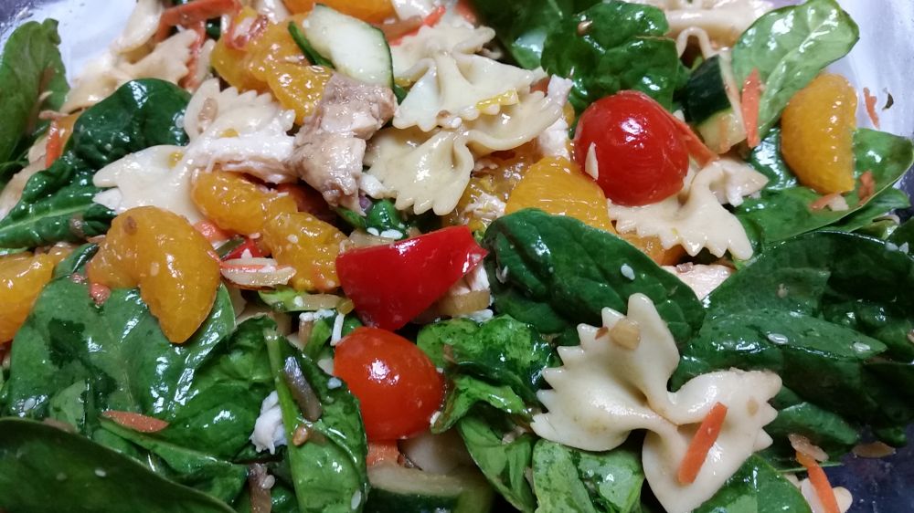 怕孩子们吃不惯爬梯菜,搜到这款集水果,蔬菜,pasta,鸡肉和坚果于一钵的健康沙拉。自制的沙拉酱也很有中菜味道,混合姜蒜醋糖,澄汁和麻油。结果这款色彩缤纷的沙拉大受欢迎!