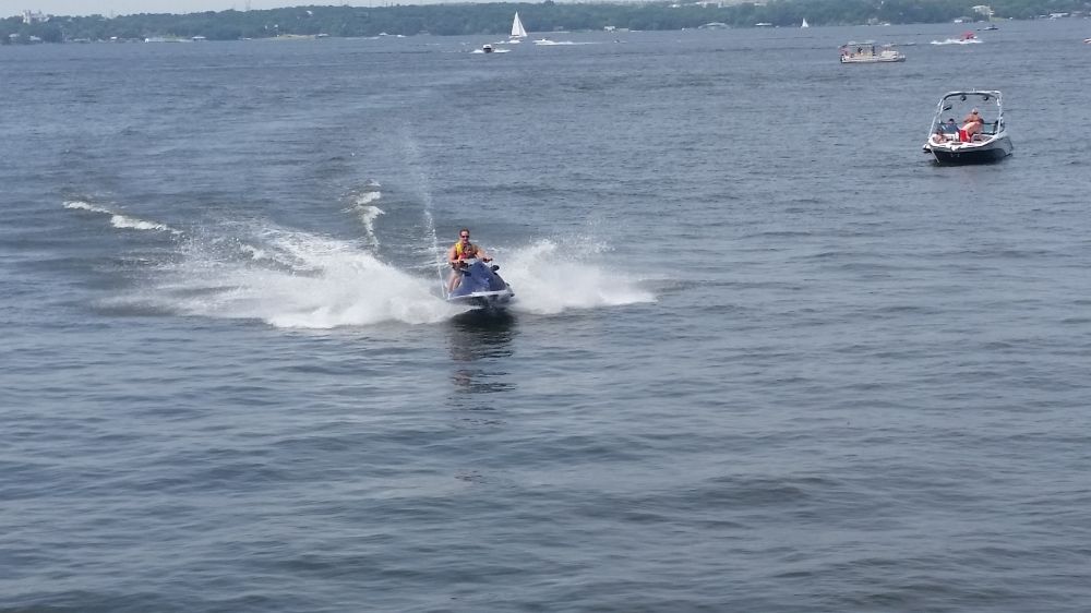 最后才轮到老婆。当天湖上的风浪很大,颠簸得我全身骨架都散了,很是惊险刺激!大叔在广阔的湖上飞飙耍酷,我死死地楼着他的腰,还是好几次差点被抛下快艇,吓得我莫名其妙地狂笑不止。如果把当时的窘态拍下来,一定很欢乐:)