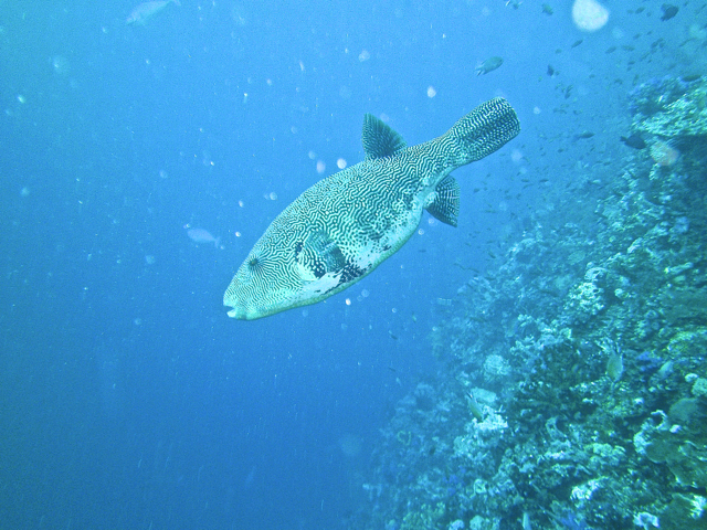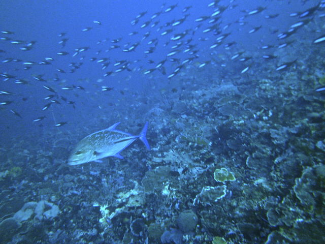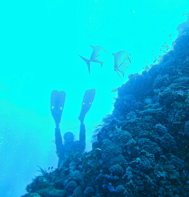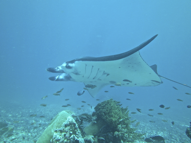 接下来的几天潜了二十几个海区,每天潜水4次。最难忘的是曼塔(manta ray), 潜伏水下静观它们飘飘欲仙的泳姿有催眠作用,差点忘记氧气瓶内容有限必须及时走人。有次临晨六点潜水,正是海中食物链活跃期,只见不同鱼种在不同深度以不同方式按照统一的海洋法则捕食:大鱼吃小鱼,小鱼吃虾米,虾米啃沙泥,比人类游戏规则更诚实可靠,不带半点虚伪。最后一次潜水在巴特伯龙岛(Batu Bolong), 这是个巴掌大的小岛,夹在海峡当中,潮涨潮落时四面都有暗流,只能趁持续1个多小时左右的平潮期(slack tide) 快速下潜到20米深度观鱼,否则就有被急流卷走的危险。我下潜后感觉暗流涌动,方向难以控制,好在领队Finn熟悉地形,紧跟着他漂游直到暗流明显减缓。巴特伯龙岛果然名不虚传,这里的鱼数量和种类都比其他地方要多,形态各异的鱼群在繁花似锦的珊瑚中穿梭起舞,令人目不暇接。不料我懵懂中把相机在防水壳里放反了而无法拍照,再出水必须征得领队同意,而水下对话靠手语,沟通费力耗时,只好看着水晶宫般的仙境干瞪眼,自恨了好几天。