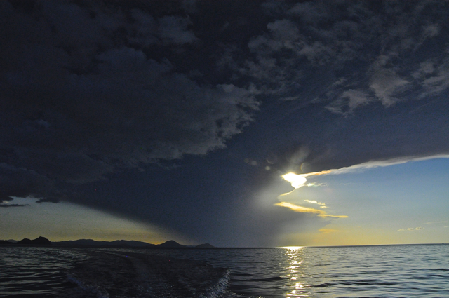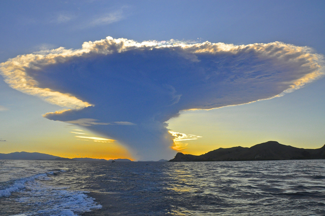5月30日下午4点多,潜水结束,我离开”蒙娜丽莎”乘快艇回拉博巴久岛。快艇在海面疾驰,迎面扑来的海浪打湿了我的衣服,同船的印尼水手见状甩过来一条毛巾,我裹住头只露出眼睛,背对着前方而坐。巴特伯龙岛渐行渐远,突然,我注意到岛后海岸线上冒出一朵象原子弹爆炸后的巨大蘑菇云, 根部不断冒出暗红的浓烟,“火山爆发!?” 我不确定地叫着。快艇上除操舵手外还有两个准备上岸休整的印尼水手,都不懂英文,他们朝我指的方向望去,转过身若无其事的说 “Gunung barapi!” 我事后古狗才知道这是印尼语的火山。我费了很大劲才取出裹上防水袋的行李中的相机,一边努力平衡,一边用毛巾裹着相机狂拍。