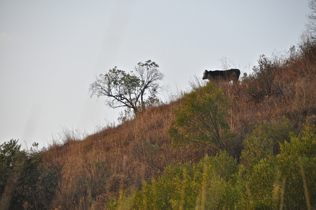 归途上,我无意中回头向远处山岗望去,一层薄雾冉冉上升。Frank说那是当地农民烧秸秆的烟尘。落日余晖下,有头牛在草丛里目送我们。