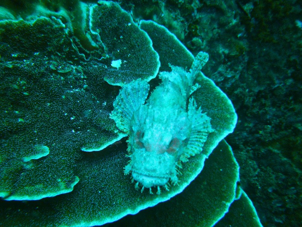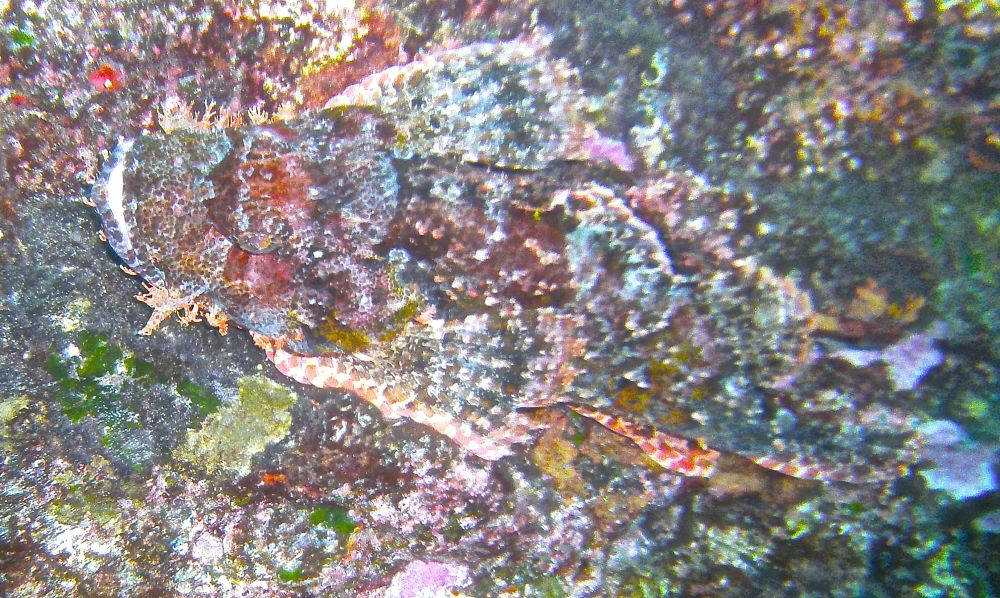 穿迷彩服的蝎子鱼(scorpion fish), 喜偷袭扑食,人一旦被咬,患处红肿痛痒难忍,经久难消。