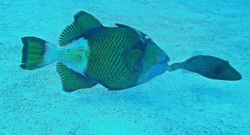 清洁鱼(cleaning fish)吃鼓鼓鱼(puffer fish)腮里的细菌,鼓鼓鱼保护清洁鱼,完美共生。