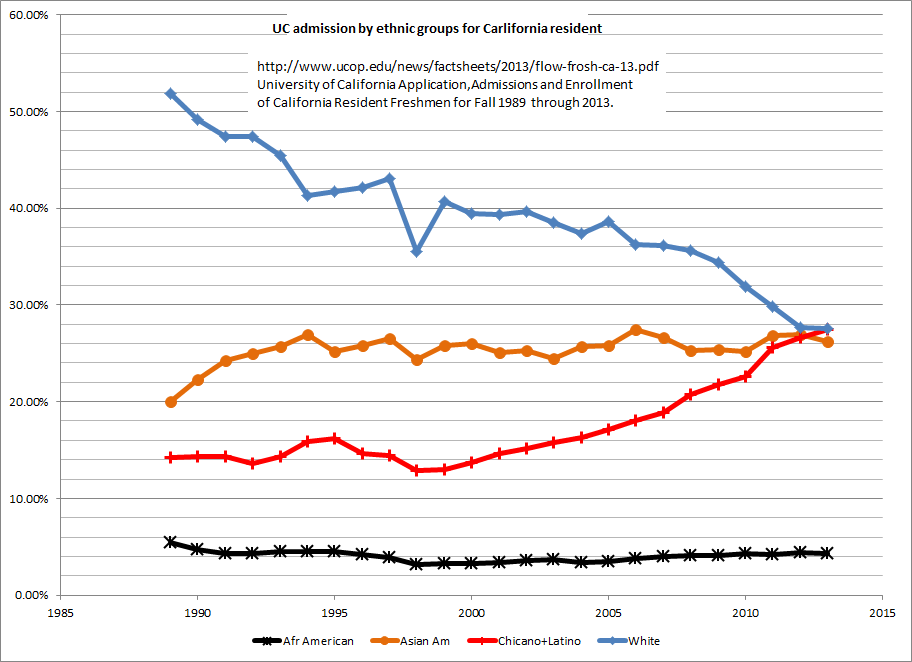 我的统计表明,西裔在UC录取率和入学率都不低,甚至很高。非裔持平或略有下降。白人降得很多。亚裔也持平。为什么UCLA校长会有他的那个公开信呢?因为亚裔在高竞争的UCLA和UCB被录取率高。在这两校比例高但并不表明整个UC系统没有多元化。