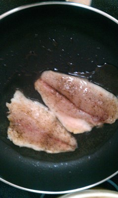 平底鍋加热,待热透,放少许橄榄油或菜籽油,待油热,放入魚排,魚皮朝下。此时向魚肉面撒少许盐和黑胡椒,用二手指轻压几下魚排,以便魚皮面全能贴着锅底。煎魚时千万不要翻动魚排,这样才能煎出不破损的魚皮。约5分钟万后,抓住把手前后推动平底鍋,看到魚排不粘鍋,能前后移动,这说明魚皮已经成型。用中火再煎8-10分钟,此时可见魚肉开始由周边变白,用湯匙把鍋边热油淋在魚肉上,使加快魚肉变熟。待魚肉全成白色,即熟。
