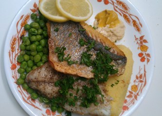 煎好的魚排可配青碗豆和古斯米(CousCous)饭,如配喝红葡萄酒更美味。魚头与魚骨我燒中式魚汤,加点雪里红咸菜和豆腐,可谓一魚二吃。