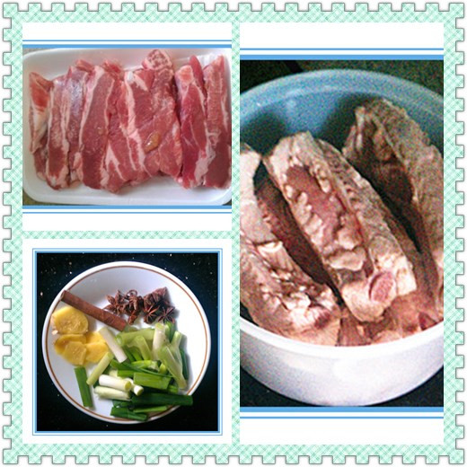 材料:上等肋排500g,青葱6根,生姜6片,桂皮1片,八角4只,黄酒1杯,鳮湯2杯,食盐少许,白糖少许 ,冰糖1小块。