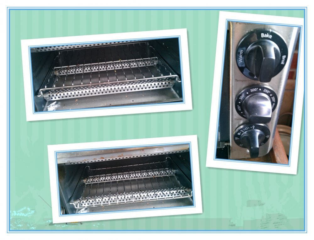 2)启动台式小型烤箱,设功能“Bake”,设时间“10分鈡”,设温度“250摄氏度”。选向上位烤架插入两侧低位槽。预热。