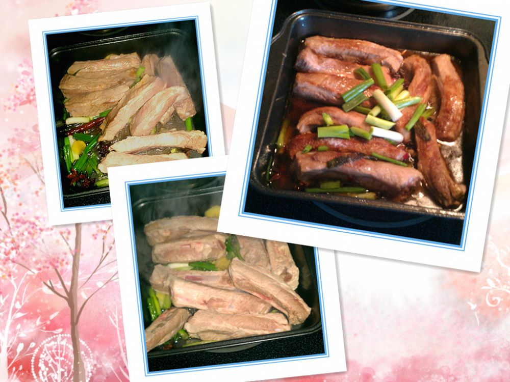 1)肋排经开水川过。把烤盘放置炉灶上,加入2勺食油,待油热透,放入肋排四面煎黄。加入切细的青葱、姜片、桂皮、八角。再加入黄酒和鳮湯,湯汁正好盖过肋排。小火慢煮半小时。
