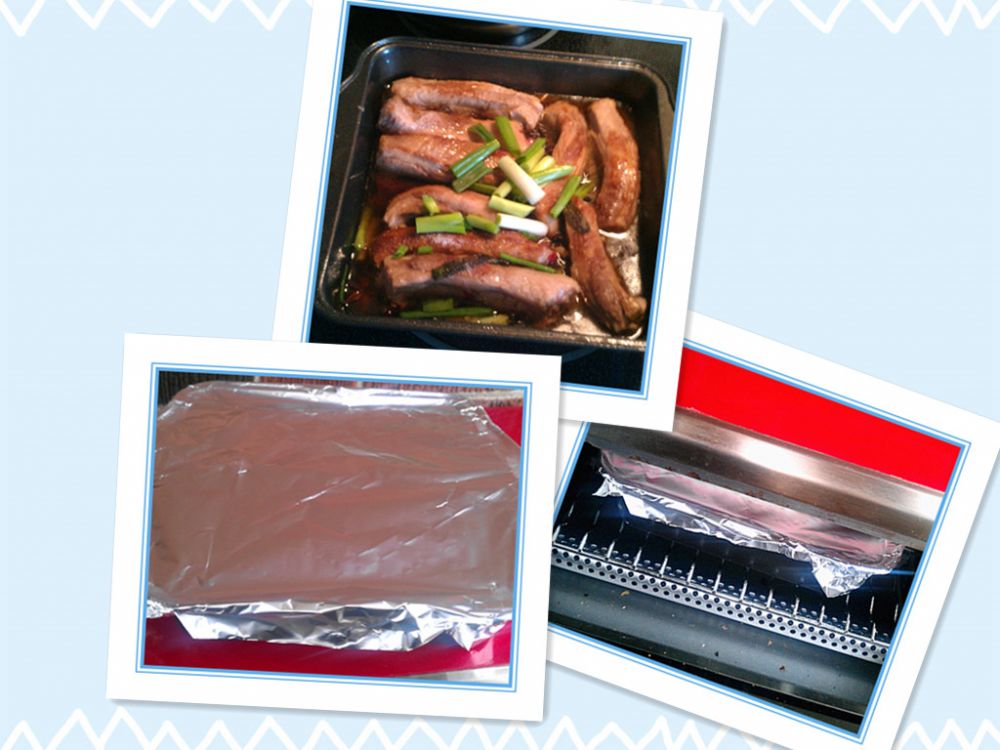 4)取出烤盘,让它放置15分鈡后,打开锡纸。另用一个平底锅,加热后,从烤盘中取出肋排,放入平底锅。把烤盘中留下的湯汁过滤后倒入平底锅。此时,很重要的一步骤要尝一下汤汁味道,如味没达到要求,加适量糖。用大火焼开汤汁,等它变浓稠,即可。