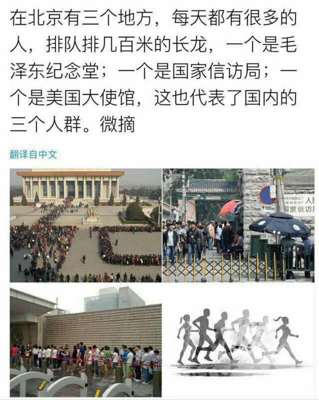 最近网上流行一张图片,说北京有三个地方长年累月人山人海:毛主席纪念堂,信访局与美国驻华大使馆。有位颇有名气的左派人士不服气,在网上批文指出:“三个地方的人群 是有重叠的。信访的人 会去大使馆 政治庇护到美国。”
