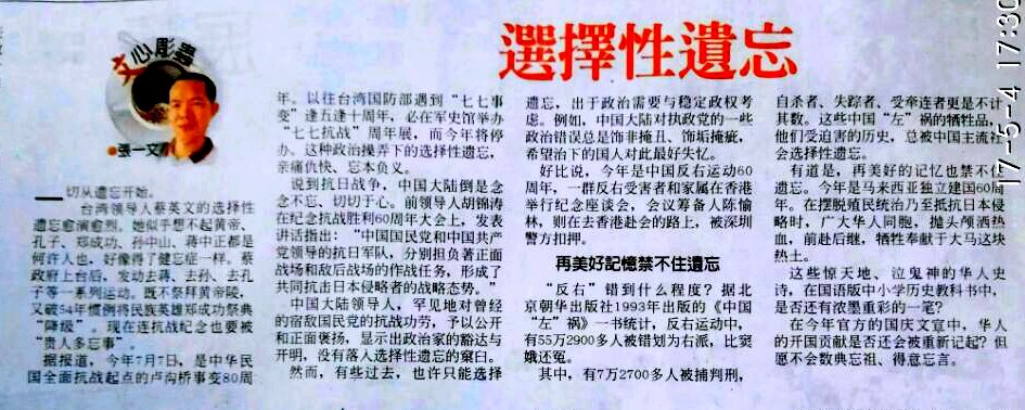 然而,有些过去,也许只能选择遗忘,出于政治需要与稳定政权考虑。例如,中国大陆对执政党的一些政治错误总是饰非掩丑、饰垢掩疵,希望治下的国人对此最好失忆。好比说,今年是中国反右运动60周年,一群反右受害者和家属在香港举行纪念座谈会,会议筹备人陈愉林,则在去香港赴会的路上,被深圳警方扣押。“反右”错到什么程度?据北京朝华出版社1993年出版的《中国“左”祸》一书统计,反右运动中,有55万2900多人被错划为右派,比窦娥还冤。其中,有7万2700多人被捕判刑,自杀者、失踪者、受牵连者更是不计其数。这些中国“左”祸的牺牲品,他们受迫害的历史,总被中国主流社会选择性遗忘。