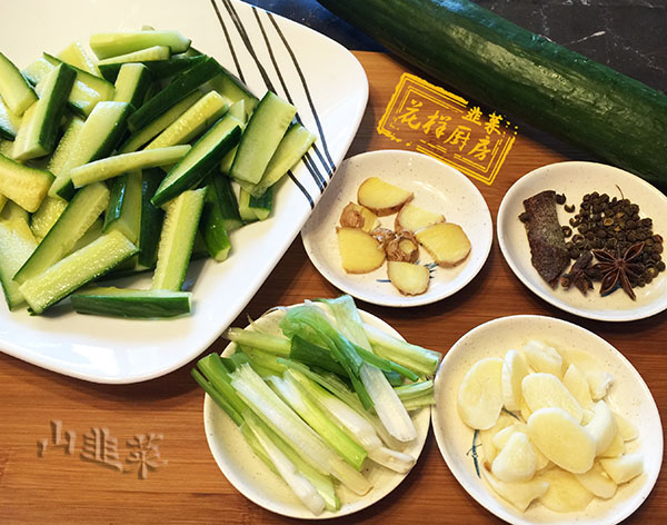 酱西瓜皮的配料与酱黄瓜的一样。生姜,葱,蒜,八角,花椒,桂皮备齐待用。