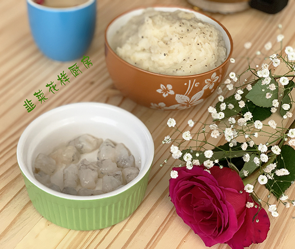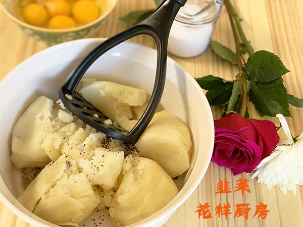 土豆的前半生。4个土豆煮熟,去皮加盐和胡椒搅拌成土豆泥,备用。