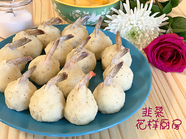取一团土豆泥,将虾包住,将虾尾露出,整形,备用。