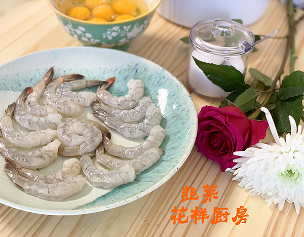 新鲜大虾,用剪子将每只虾的头部剪去1/4,备用。