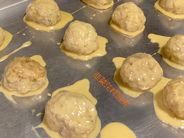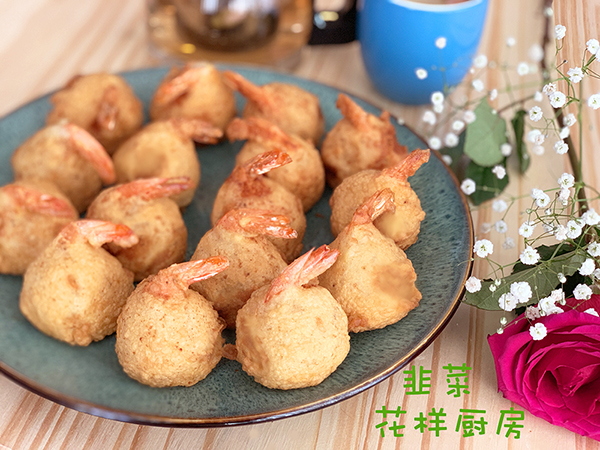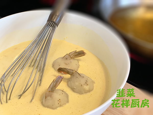1/2杯面粉,3个鸡蛋,加水搅成面糊。裹好土豆泥的虾球,蘸面糊。
