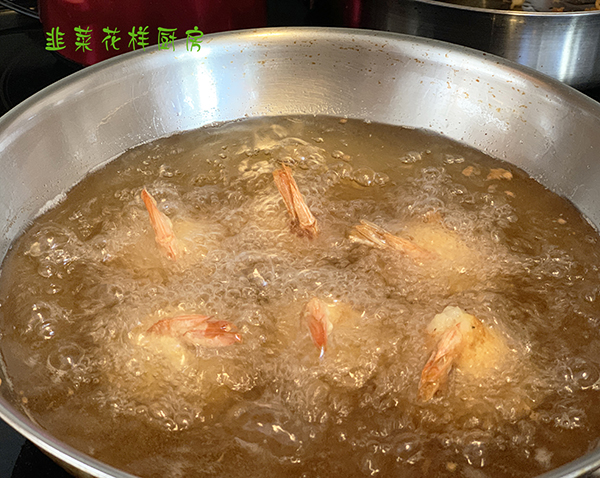 锅中放油,开中火。油热后,将蘸过面糊的虾球炸至金黄色,即可出锅。