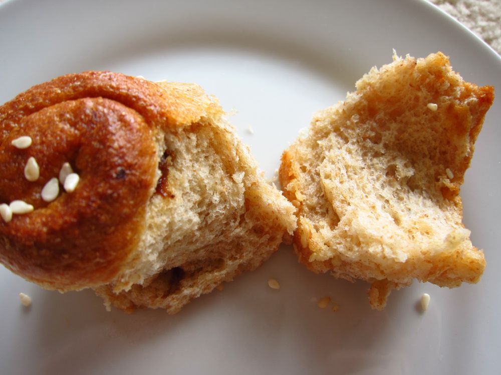 毛毛妈的方子, 昨天照原方做了, 很好吃, 这次琢磨着用了一半白面一半全麦面, 糖少放些, 加了葡萄干.