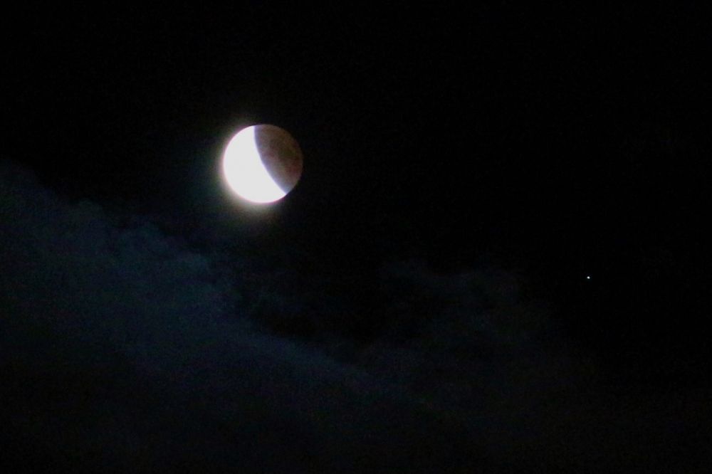 5. 风卷云衬月 4. 恢复如常。 3.放大些 2. 对暗处曝光,才显出“血色”那面,但亮側则显出了不需要的月晕。 1. 先前有云遮月,2AM Pt 发现月偶在云隙中闪脸,慌忙抢了几张。