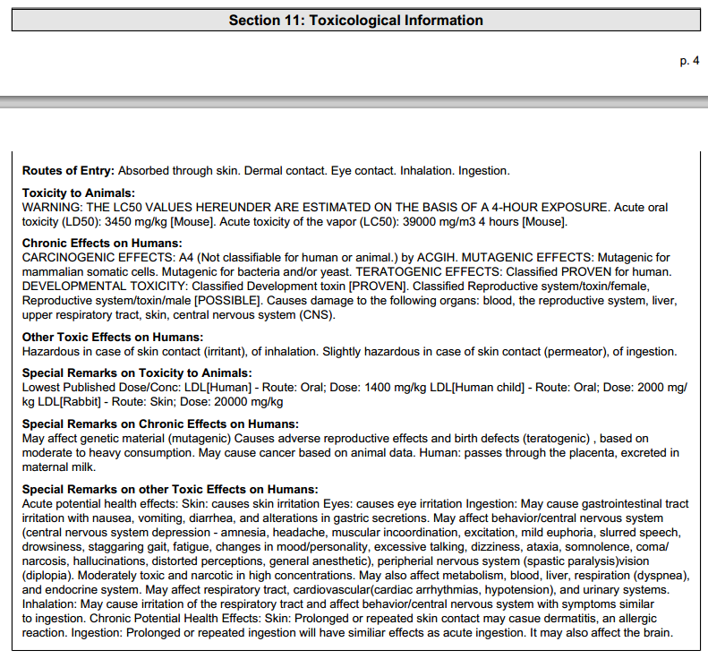 看看下面酒精(乙醇)的 MSDS (material safety data sheet), 看看都列出了哪些毒性?