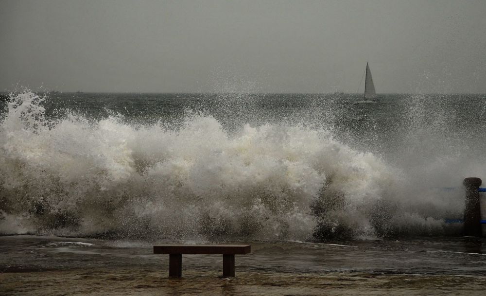 他像一棵小草一样瞬间被巨浪扑倒吞噬, 不容他有任何反抗。我们全惊呆了, 一种不祥的感觉在心里忽悠。浪花过后, 发现他居然俯卧在护栏石柱后面。 有人喊了一声快, 顿时三四个人冲了过去, 趁下次大浪到来之前, 把他拉了回来。 我相信这是那天所有在场的人最开心的一刻。拉回来后, 他手里的雨伞、鞋子不见了,人懵懵懂懂的,由于发抖,身上的水珠落下时呈现奇怪的弧线。感谢苍天,有惊无险, 人间又少一悲剧。这哥们是一外地游客, 自称走南闯北见得世面很多。我纳闷他哪来那么大的胆量敢站在巨浪面前不躲避,他说从来没这么近距离接触这么壮观的浪花, 就想经历一下。后来我问他, 我们那么多人在喊你快躲开, 你怎么不躲呢, 他回答, 我还以为就像泼水节那样,只不过身上多泼几桶水, 也挺刺激的。当时我们就笑了, 问他, 哥们, 你没觉得这水桶个头有点大吗?过了一会, 这哥们一边拧干汗衫的海水, 一边自言自语,带着困惑,手还在不由自主的抖着, 认真地总结道, 这水是比那个大的,它怎么还会扯着腿往海里拽我呢?