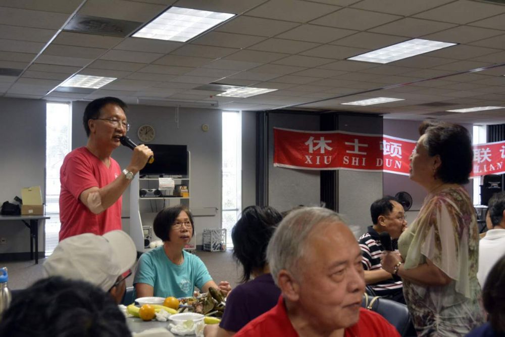 “酒”过半巡, 知青联谊会的大牌名主持人董思奇 (后)就上台宣布端午节聚会节目正式开始。她先请知青联谊会会长冯雪讲话。干练的新会长感谢了所有为聚会作出努力的理事们,会员们,强调了知青的友谊长存。寥寥数语,却道出了大家的心声。