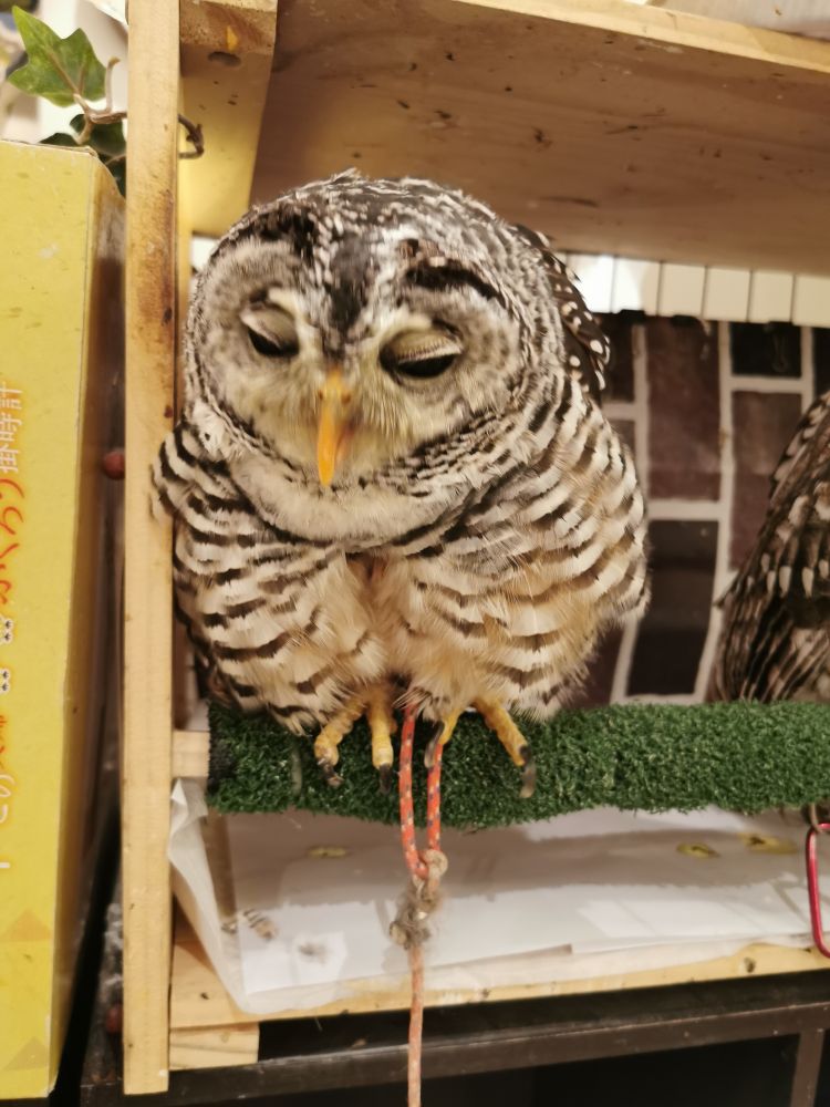 叫“咖啡”,却不是一个可以享受咖啡的地方,而是一间小小的猫头鹰私家养殖屋。一般都是主人把个人爱好和生意结合起来做,上次在横滨也去参观过一间猫头鹰咖啡,那间比这一间大多了,猫头鹰的品种也多。但这一间的主人是个帅哥,暖男型的,会讲英文,给了我们很多非常棒的拍照的建议。还聪明地衍生出很多猫头鹰产品,比如用猫头鹰羽毛做的胸针,猫头鹰形状的耳环;还有其他文具和小饰品,玩具,更在一面墙上陈列所有猫头鹰照片,让客人在离开前,选出自己心仪的一只(在照片下面贴上小星星)。图2就是最受欢迎的一位。