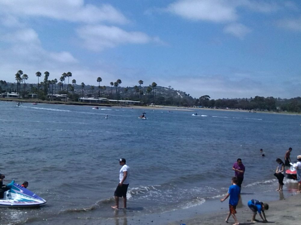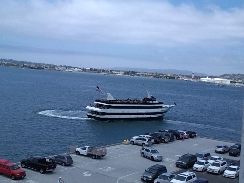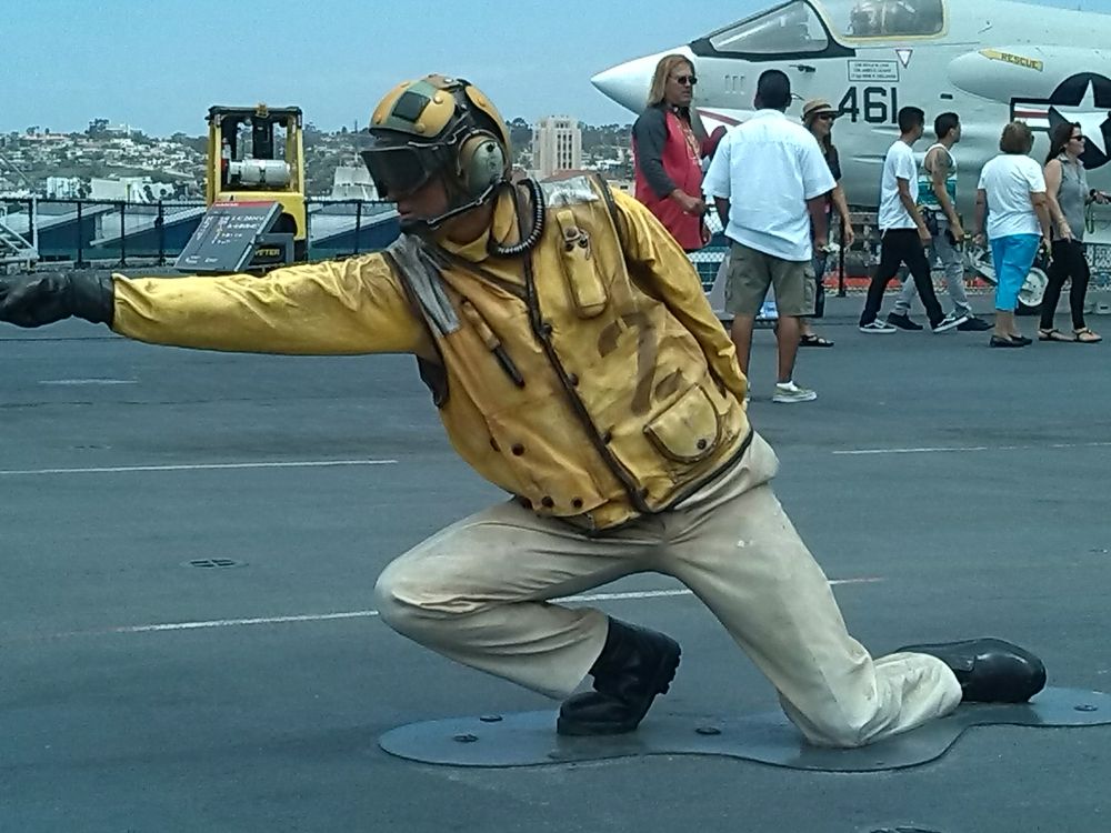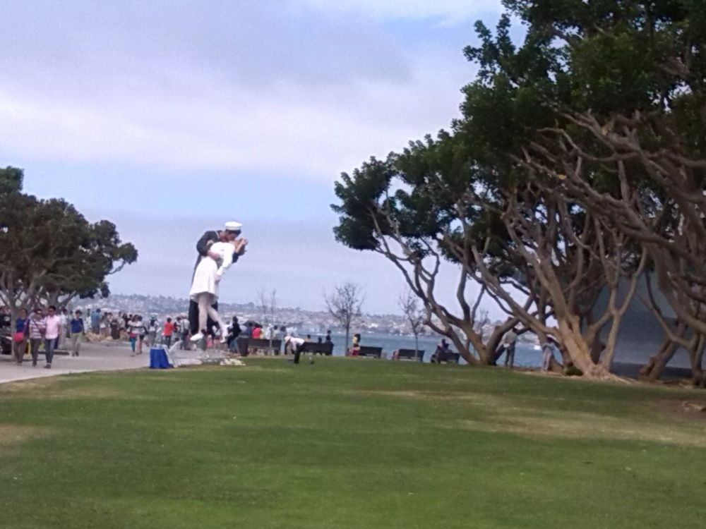住了不到一周,我开始想念多伦多夏天的雨,雨会让生活有诗意的,这艳阳高照的日子只有在冬天才是最想要的。在7月14日一个艳阳高照的早上,9点钟,我们就出发前往尔湾附近的圣地亚哥了,车是租的,当天还要回尔湾住的。拿好GPS,车子驶上5号公路,开了有40分钟看到右边的大海了,那么蓝。而路边的树有的叶子干了,草也枯了,有些地方是秃山,象拍西部片那地方,有点象hollywood 的样子。大约一个多点小时就到了圣地亚哥了。直奔那个 uss midway museum, 就是一个退役的航空母舰。在地图的指引下到了港口,哇塞好多人,车子。终于找了一个parking , 要投币买停车时间的,这时后悔出来没带硬币了。此时一眼望去,看到那个塑像的不远处有个大的中餐馆,海鲜馆,决定进去碰运气换硬币。拿了十块钱纸币进去了,里面好大,一个高高的白人MM挺漂亮的,一口答应给我换4刀硬币,我高兴啊,谢过她出来,买了2小时。停车问题搞定了。