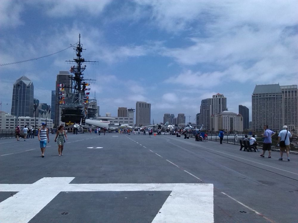 一看真是个好美的地方。于是拍照,周围不少国人的面孔,路边还有法轮功痴迷都在练功,地上写着什么东东,没敢看哈哈。路边还有小贩的车子在售纪念品,有个印度老太太还问我要不要她的手工包包,可以给我便宜点,我只是回答,NO, thank you . 有个黑人的乐队在演奏萨克斯,很浪漫悠扬的声音。后面就是著名的航母了,USS midway 。真的比想象中的航母还要大呵,几层楼高,最上面的星条旗在迎风飘扬着。这个航母曾参加过伊拉克海湾战争,如今光荣退役,供人们展览了。