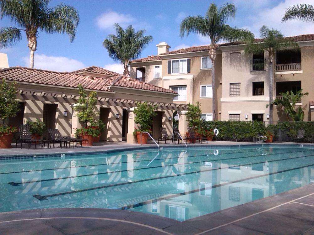 加州尔湾四季如春,每天艳阳高照的,很少下雨,因此路边的一些草都枯了,树叶的顔色也不是浓绿的,我有点可怜那里的树了呵。加州湾区的建设是80年代政府统一规划的产物,全力打造为旅游度假区,富人居住区。我们租住的房子是那种木制的3层楼房建筑,木制的房子住起来非常舒服,感觉跟很透气似的。小区的游泳池干净整齐,免费设施,可是我惧怕那只有25度的气温,没敢下水。